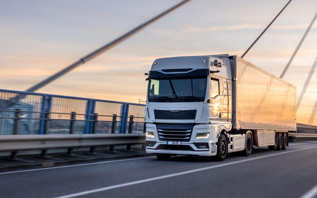 White truck crossing bridge at sunset. Urban logistics in motion.
